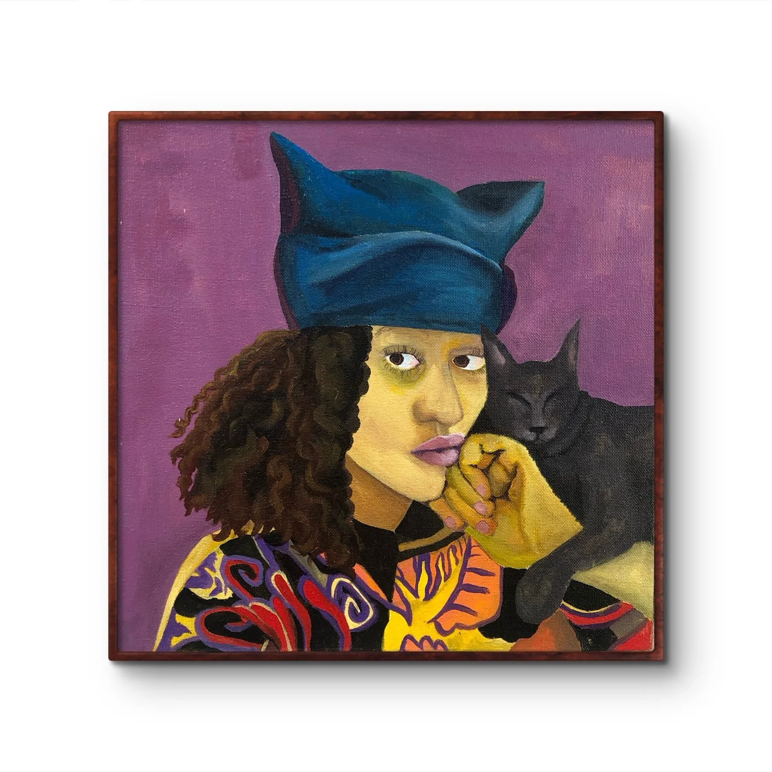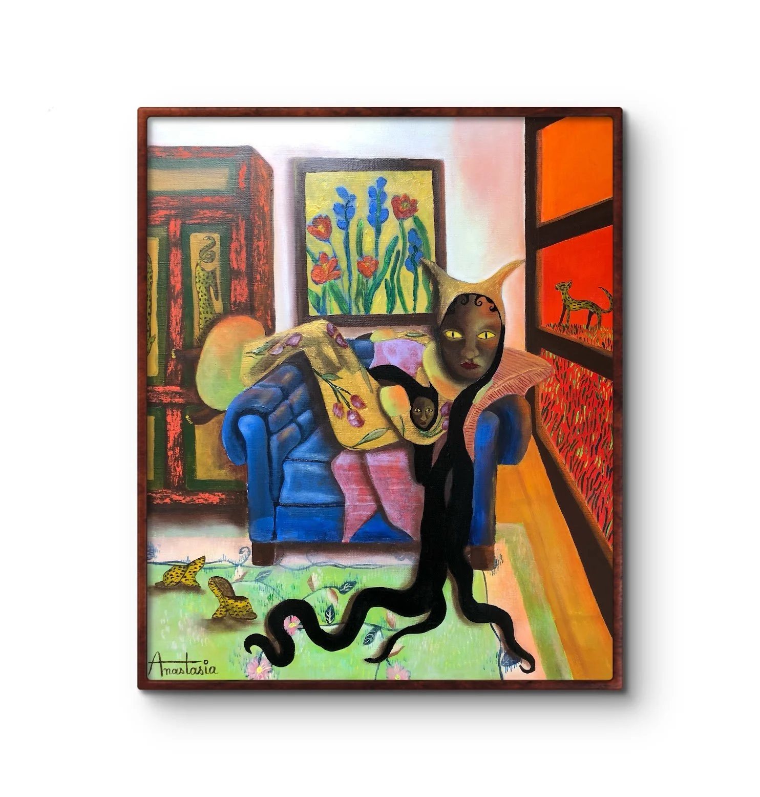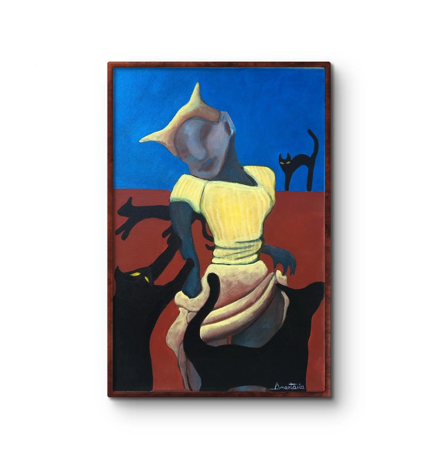 “Feline hour”, 2025, acrylic & oil pastels on linen canvas, 55 x 45 cm